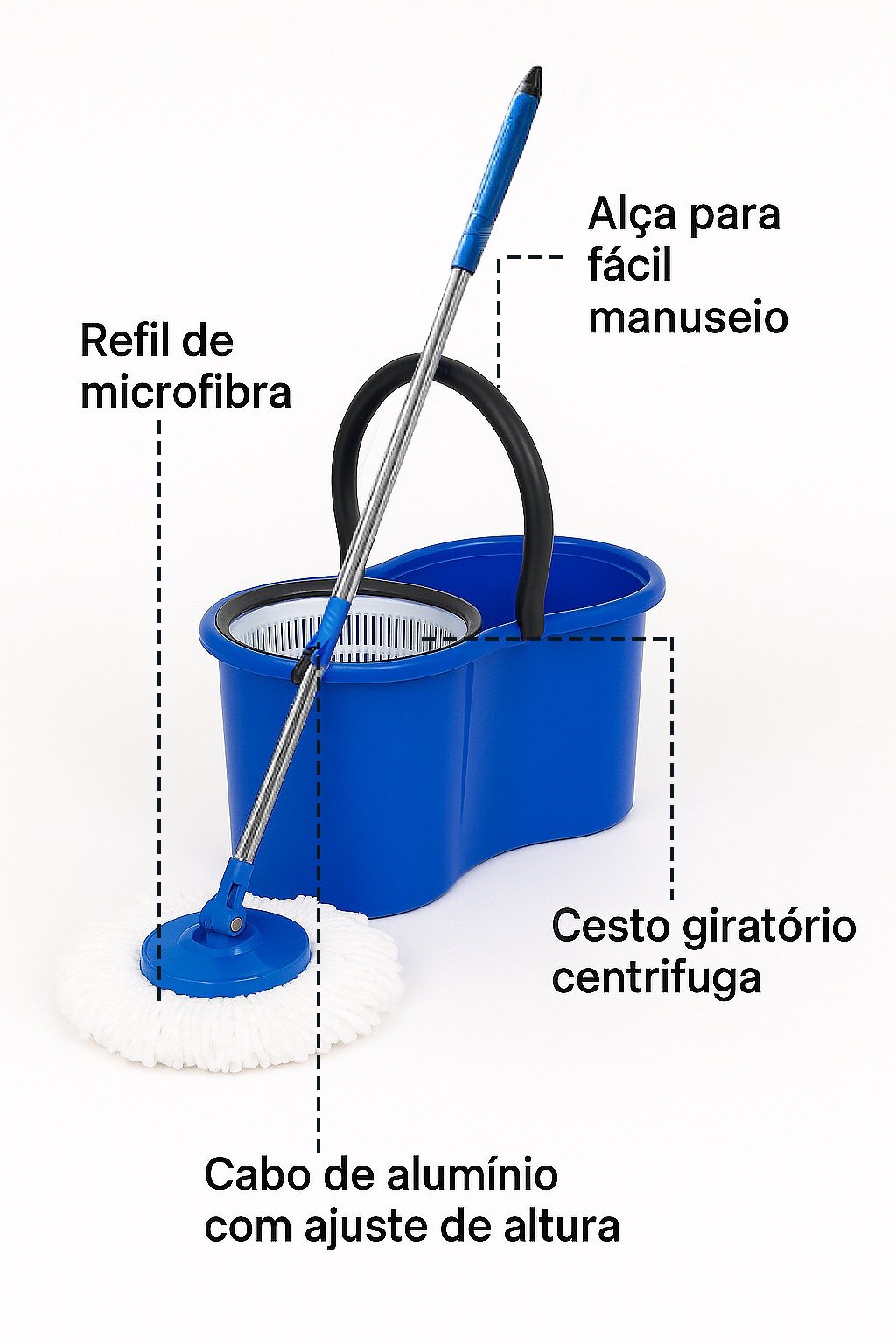Acompanha: 1 Balde, 1 cabo ajustável, 2 refil de microfibra